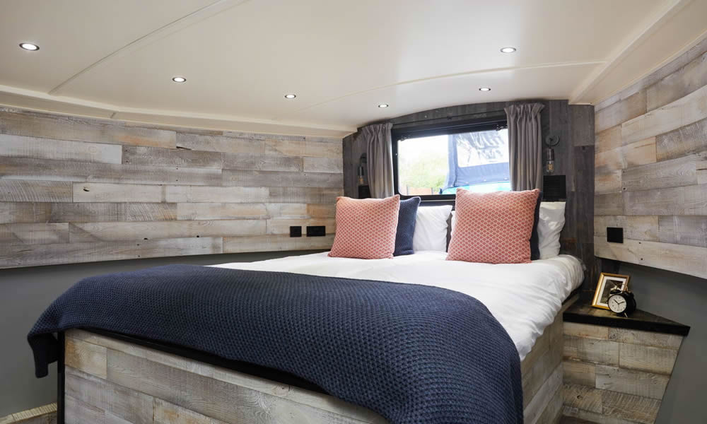Step below deck and you’ll find yourself in the deceptively spacious combined living and kitchen area. The up-to-date industrial style of the furnishings and colour scheme help open up the space which is cosy without being cramped. You’ll find everything you might need in the kitchen, from utensils to a dishwasher, and there’s a beautiful wooden dining table with room for six. The comfy sofa in the living area converts into a double bed for which linen is provided.