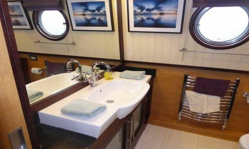Move through the boat and you’ll find the master bedroom, a twin room and a bathroom. The spacious master bedroom with its sumptuous king-size bed is located at the bow end of the boat and has doors out onto a small outdoor seating area. This is the perfect spot to enjoy a quiet morning coffee or a relaxed glass of wine in the evening. The second bedroom features two single bunk beds and a porthole overlooking the marina. The stylish bathroom with its modern tiling scheme has a shower over the bath. It is a relaxing space to run a bath and soak after a day exploring the city.